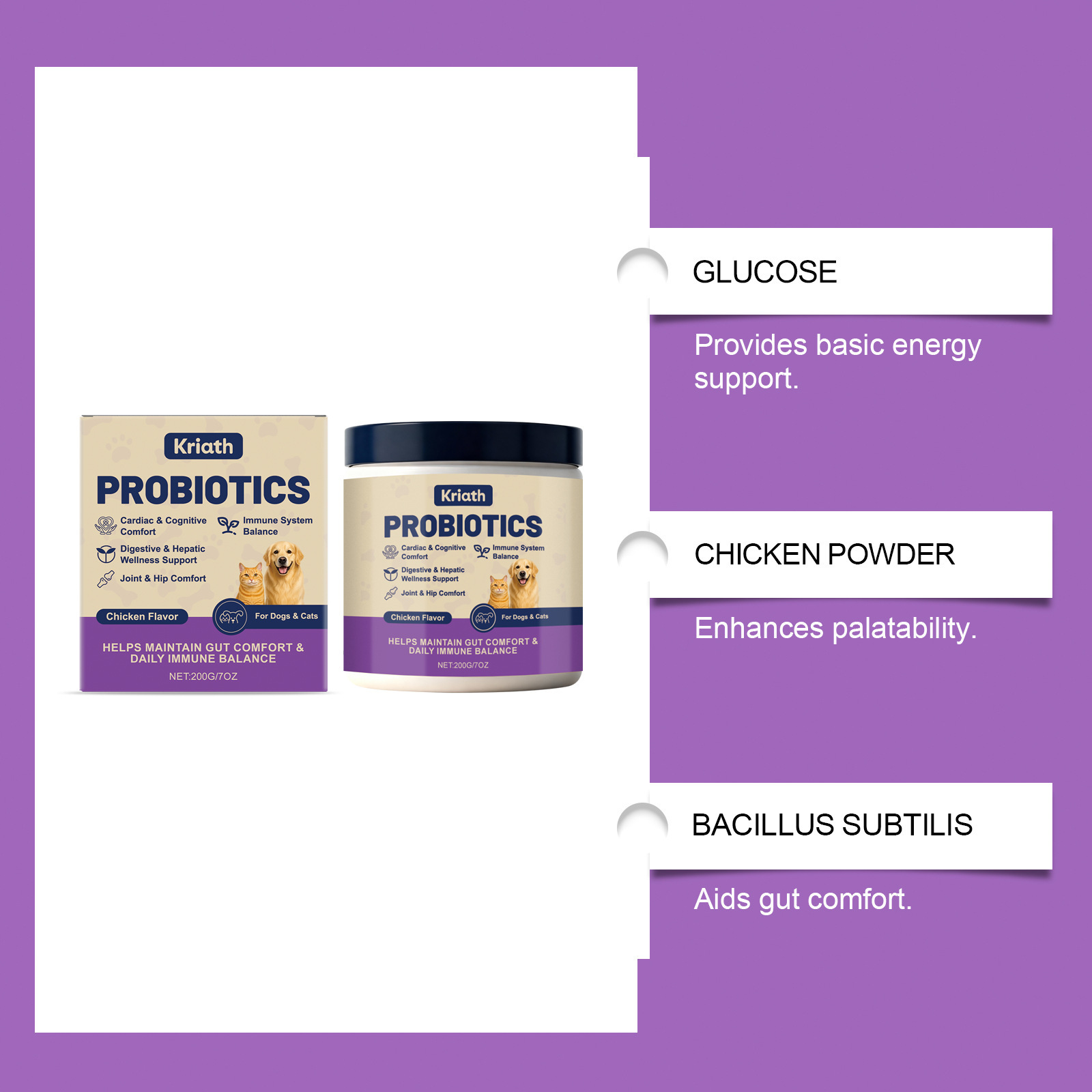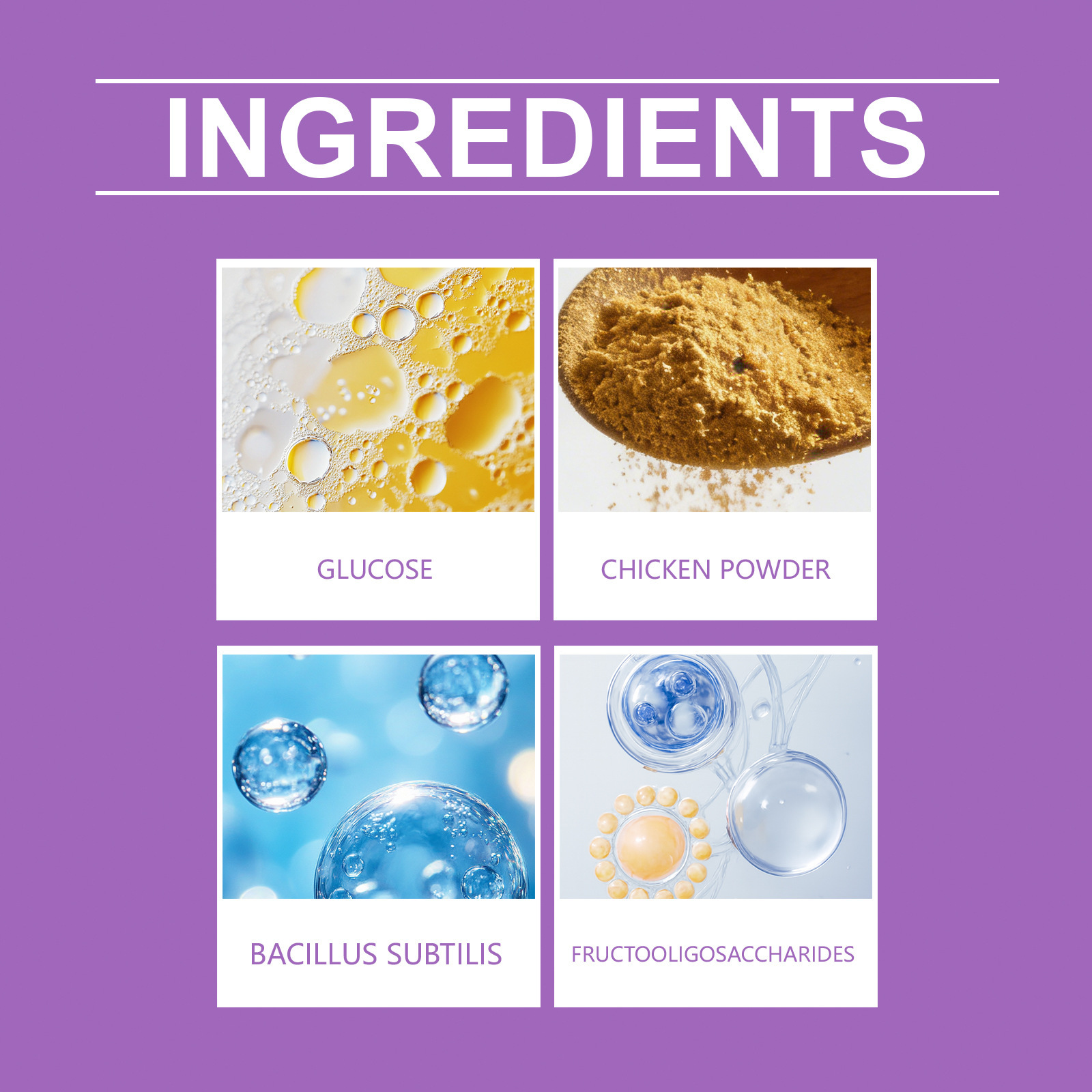 Ingredients: glucose, chicken powder, Bacillus subtilis, fructooligosaccharides.